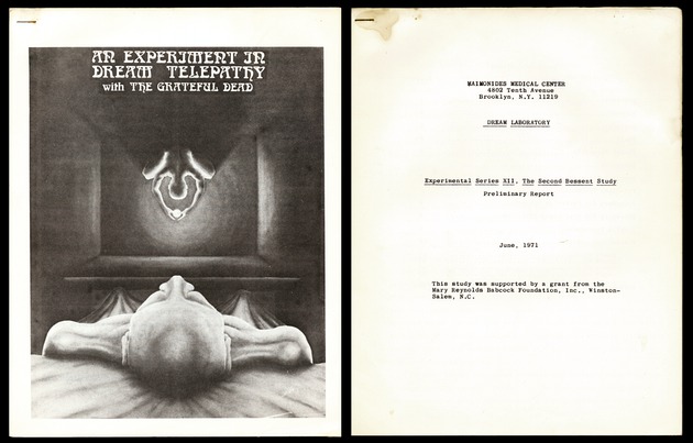 Brooklyn, Maimonides Medical Center, 1971. Two early reports on experiments in dream telepathy conducted in 1971 and "suggested by Jerry Garcia," in which randomly selected images were beamed to sleeping subjects miles away, from (in the first report) the audiences of six Grateful Dead concerts. Co-author Stanley Krippner has been, among other things, one of the leading researchers into dream telepathy and telepathy in general ("remote viewing"). He received the American Psychological Association [APA] Award for Distinguished Lifetime Contributions to Humanistic Psychology in 2013, one of many such awards he has earned over the years. He and Montague Ullman, along with Alan Vaughn, published Dream Telepathy: Experiments in Nocturnal ESP in 1973. A variant version of the first report here is transcribed on Krippner's website, where he writes "The results of this study were published in a medical journal in 1973." Both of these reports are dated 1971, the year the experiments were conducted; this appears to be the earliest formal presentation of information about this study, its circumstances, and its results. The first report is 18 pages, photocopy, with one staple, near fine; the second is 38 pages, photocopy, several small stains, one staple, very good.