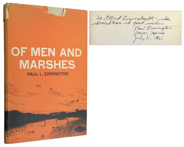 NY, Macmillan, 1957. A paean to wetlands, from a time when "of the more than 120 million acres of marshes and swamps originally lying within our boundaries, less than a fourth remain fit for waterfowl and other marsh life." This copy is inscribed by Errington to renowned Life photographer Alfred Eisenstaedt, "with admiration and good wishes," in Ames, Iowa, in 1961. Near fine in a very good dust jacket with modest foxing to the rear panel and a couple of edge chips, most noticeably at the upper edge of the front panel (not affecting any text or the illustration).