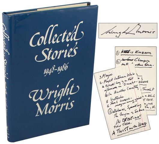 NY, Harper & Row, (1986). Morris' own "working copy," with his ownership signature and notes. Pages detached; pages 249 and forward absent: Morris apparently disassembled the book in order to re-order the stories and create a new selection, titled, or subtitled, by hand, "Origins and Obsessions." His marks to the contents page and with two index cards of notes (written on both sides) laid in. The existent parts, including jacket, are in fine shape. A unique copy, from the author's own library, one Morris likely used to prepare for the 1988 Godine reprint edition of this title.